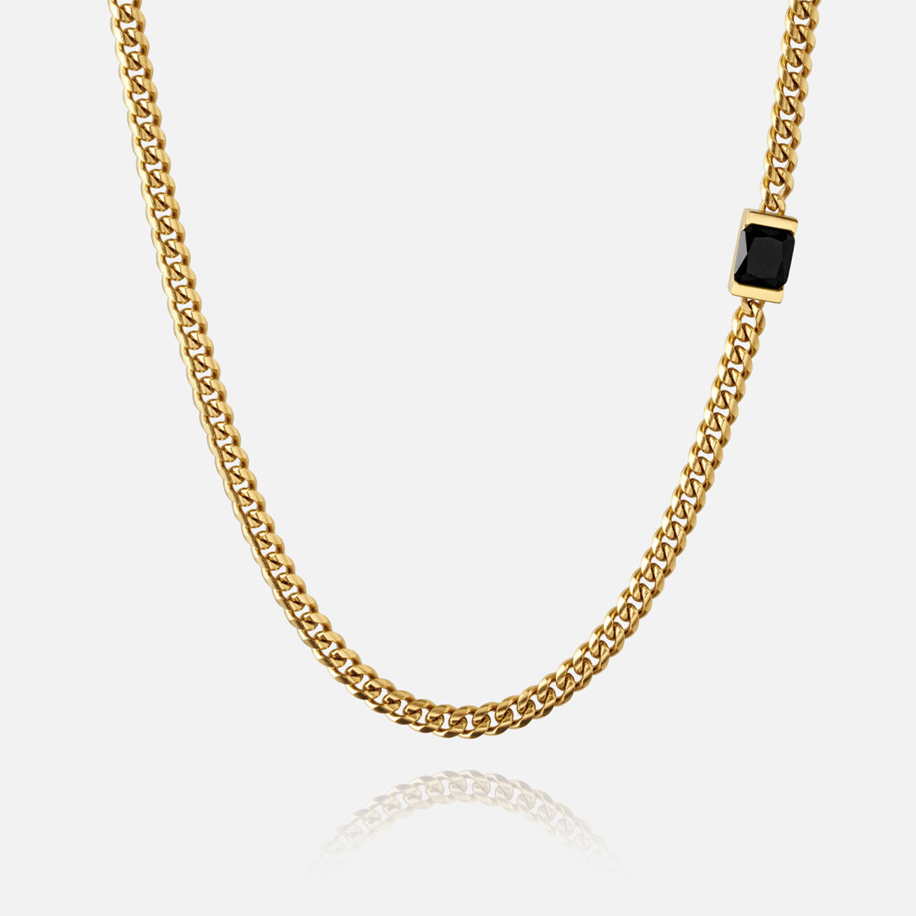 Versatile and minimal, the Chip chain is a timeless staple that effortlessly elevates. Set on a solid 5mm Cuban chain with a sturdy, easy-to-use clasp, it’s a subtle statement piece that will become the main piece of your jewelry rotation. Cut in a deep Onyx black, this sharp-edged stone is guaranteed to catch looks.