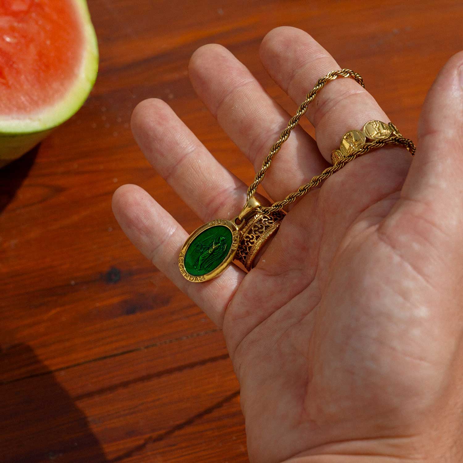 This piece features a green enamel accent, reflecting Mediterranean tones of nature and stone.