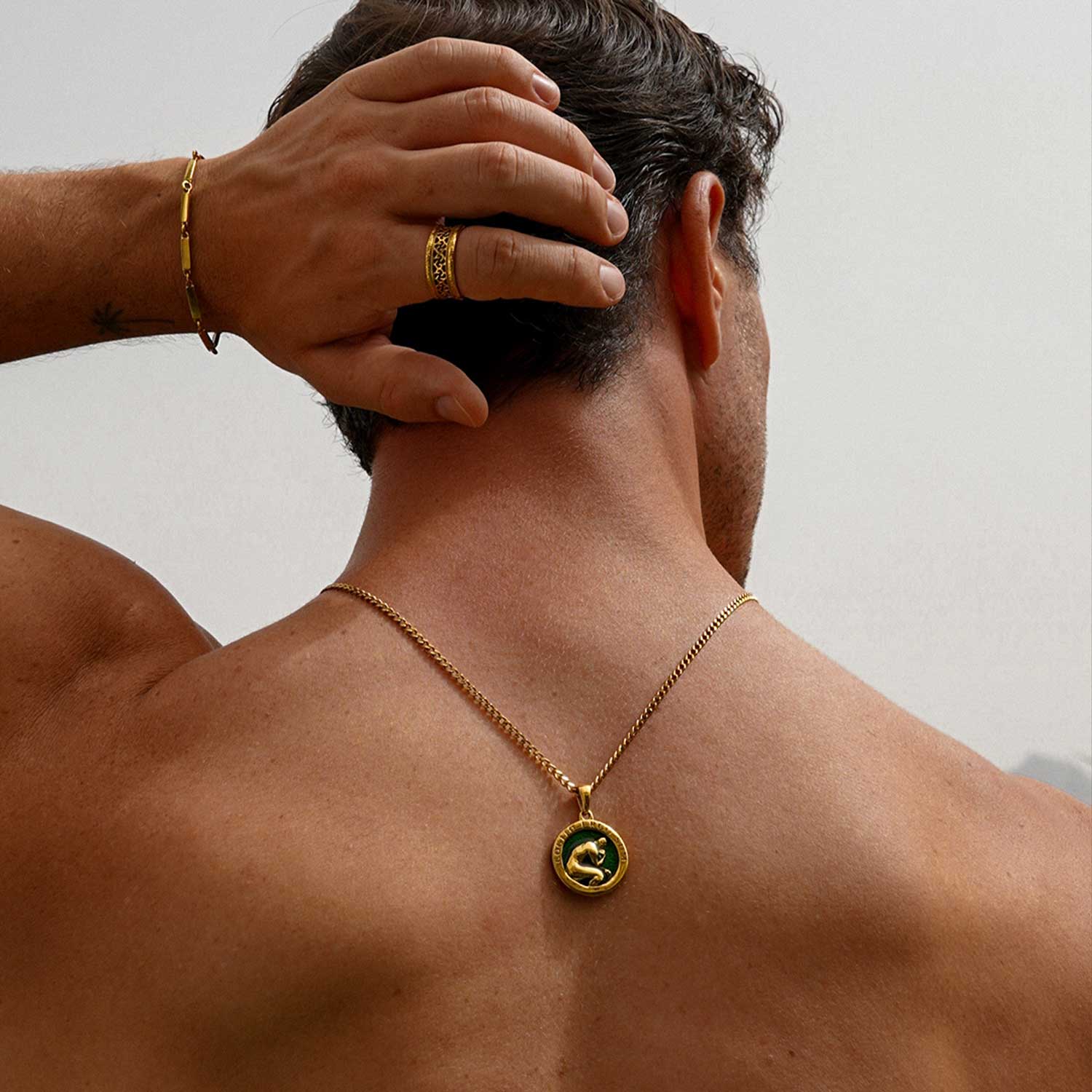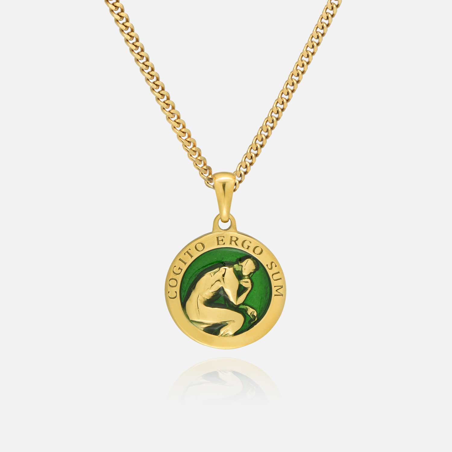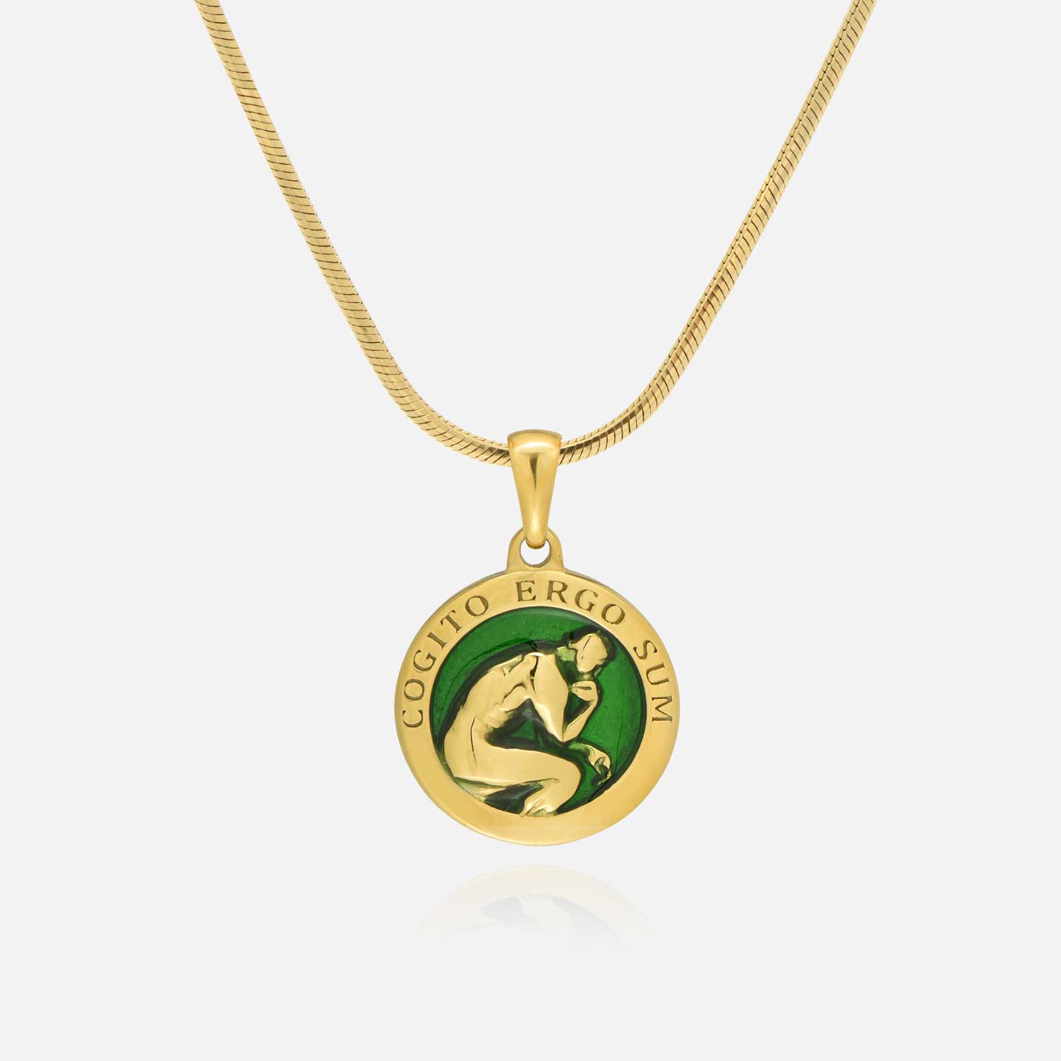 Strength, thought, and existence come together in the Thinker Pendant. It represents the grounding power of reflection — a reminder that awareness itself is strength. With green enamel, inspired by Mediterranean landscapes, it speaks to growth, renewal, and balance.