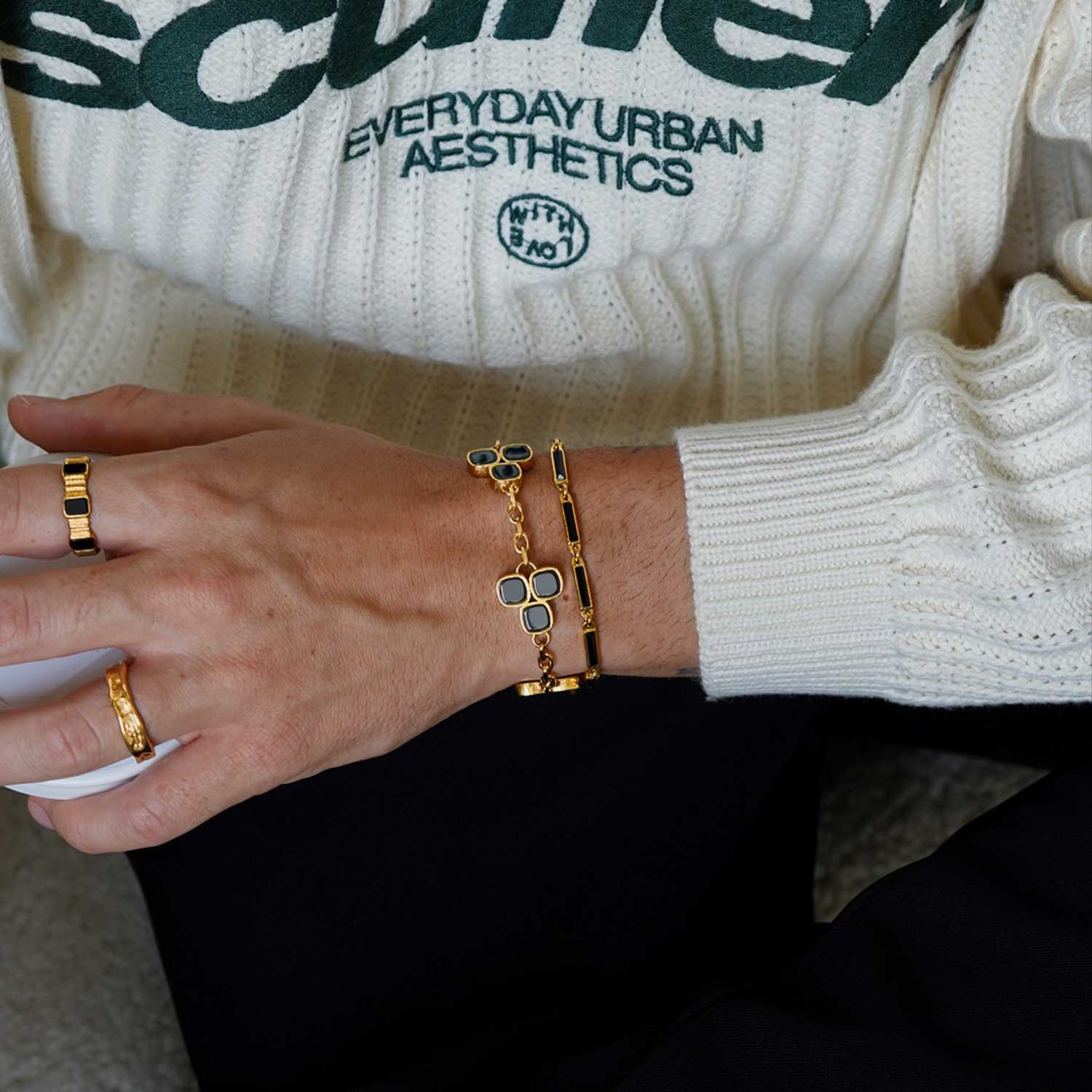 A graphic silhouette built from angular cross-shaped links, giving the piece a clean and assertive edge.