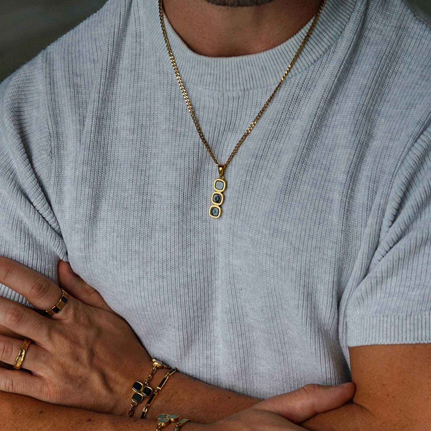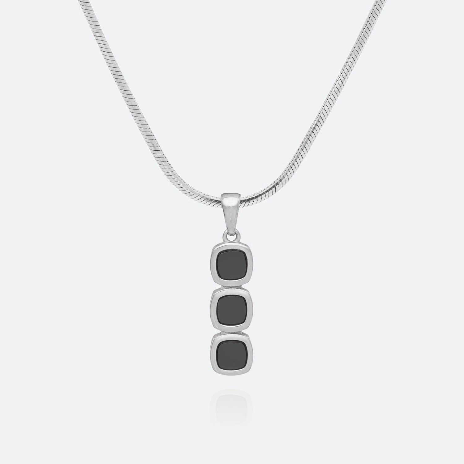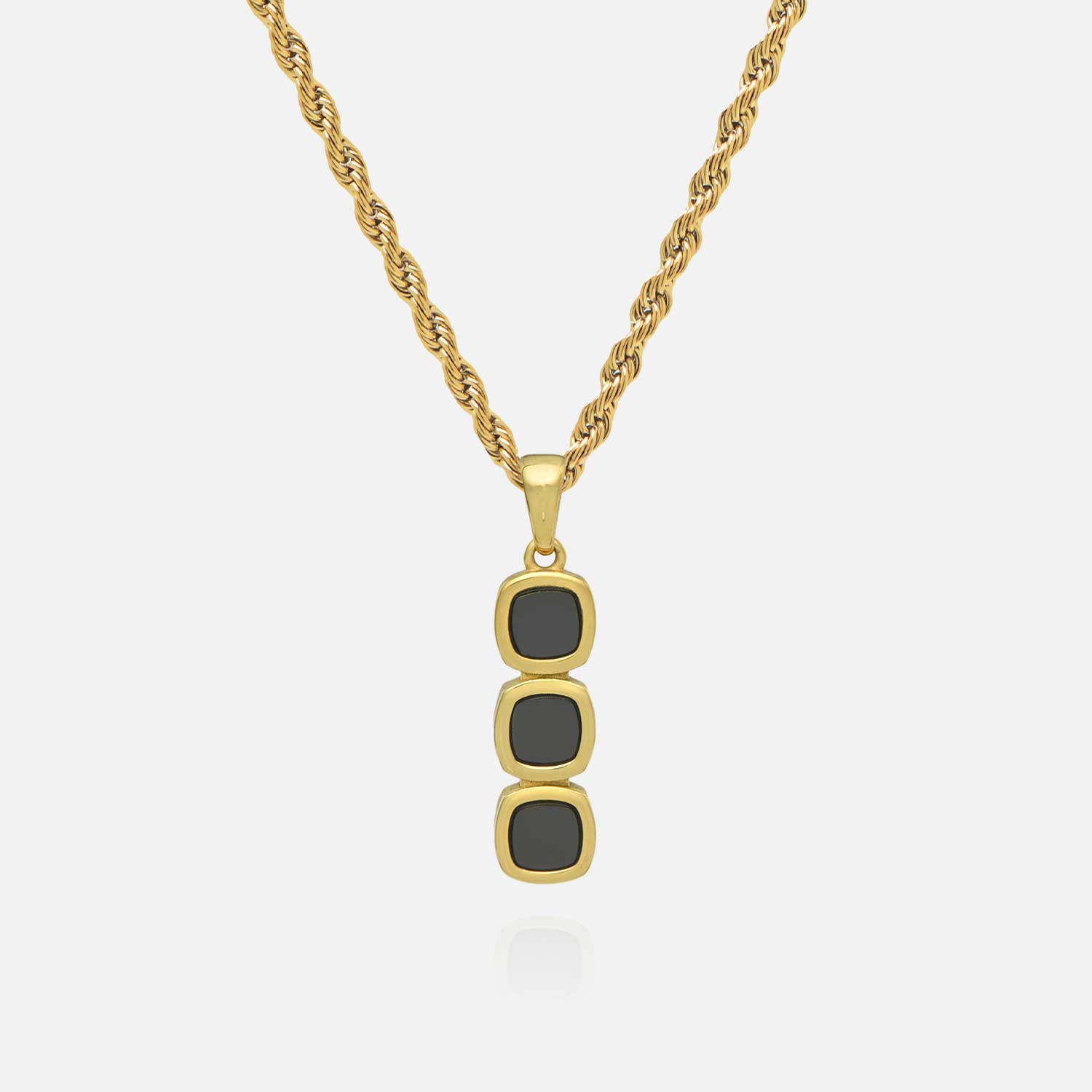 A structured vertical stack of soft-cornered square settings forms the foundation of the Totem Onyx Pendant. Each bezel is precisely aligned to create a balanced silhouette that feels both modern and timeless. The clean geometry is softened by the subtle curve of the gold frame.